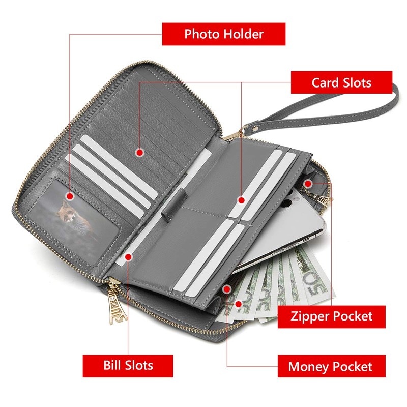 FOXLOVER Litchi Grain Leather Wallets for Women Large Wristlet Purses Billfolds RFID Card Cases Money Organizers Zipper Closure Coin Pocket(Litchi Grain-Grey)