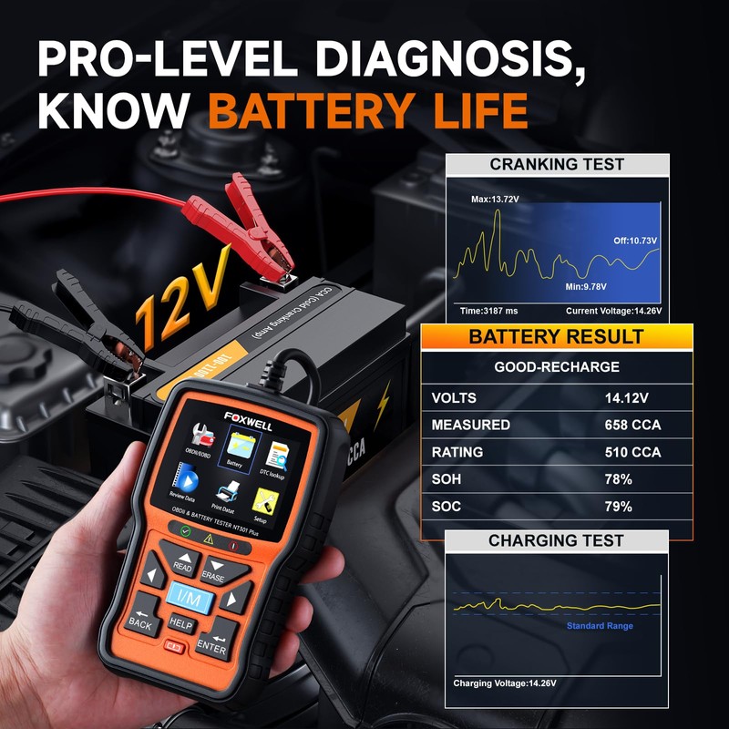 • 【More Accurate 12V Battery Analyzer】Displays multiple battery conditions, such as SOH (State of Health), SOC (State of Charge), Voltage,Current, Rating and analysis results; works on regular flooded, AGM flat plate, AGM spiral and GEL batteries with 100 to 2000 CCA. The cranking test for analyzing whether the starter motor is working properly. The role of the charging test is to check the status of the charging system to avoid damage to the battery due to overcharging or incomplete charging.