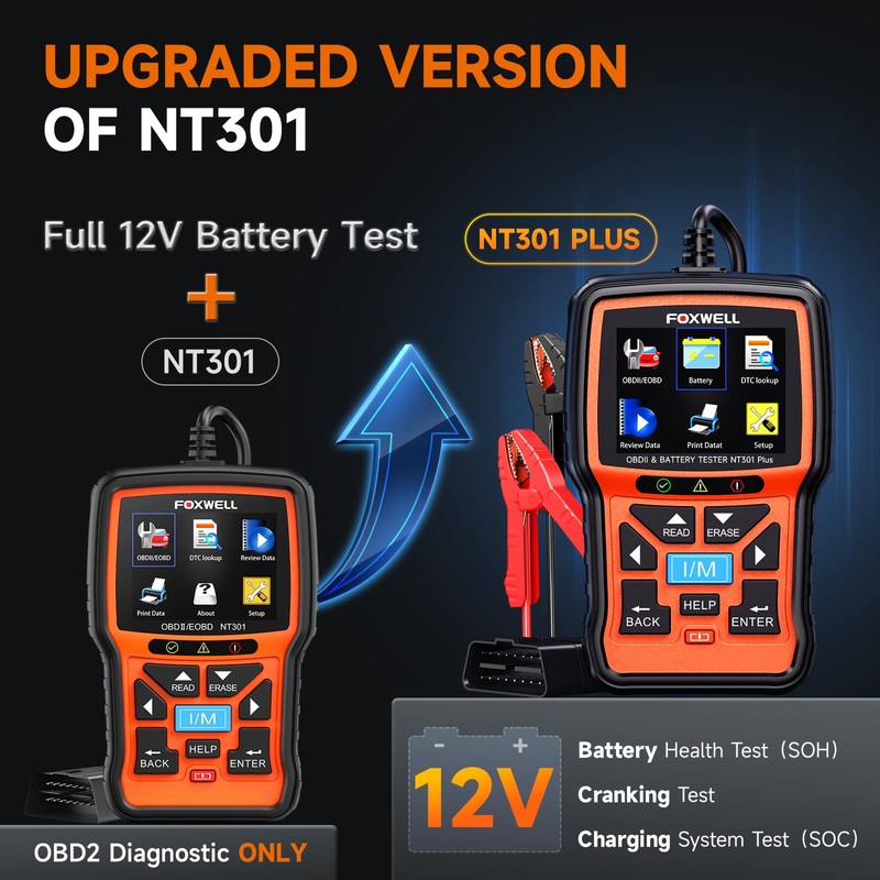 • 【The Most Versatile Vehicle Doctor】As enhanced version of foxwell nt301, nt301plus car code reader covers all nt301 OBD functions, also come with 12V battery health, starting(cranking) and charging system test functions. It provides an easy and affordable solution for locating common vehicle problems quickly, designed for home car owners, beginners, DIY users and technicians. Moreover, it will save lots of car maintenance costs and time for you.