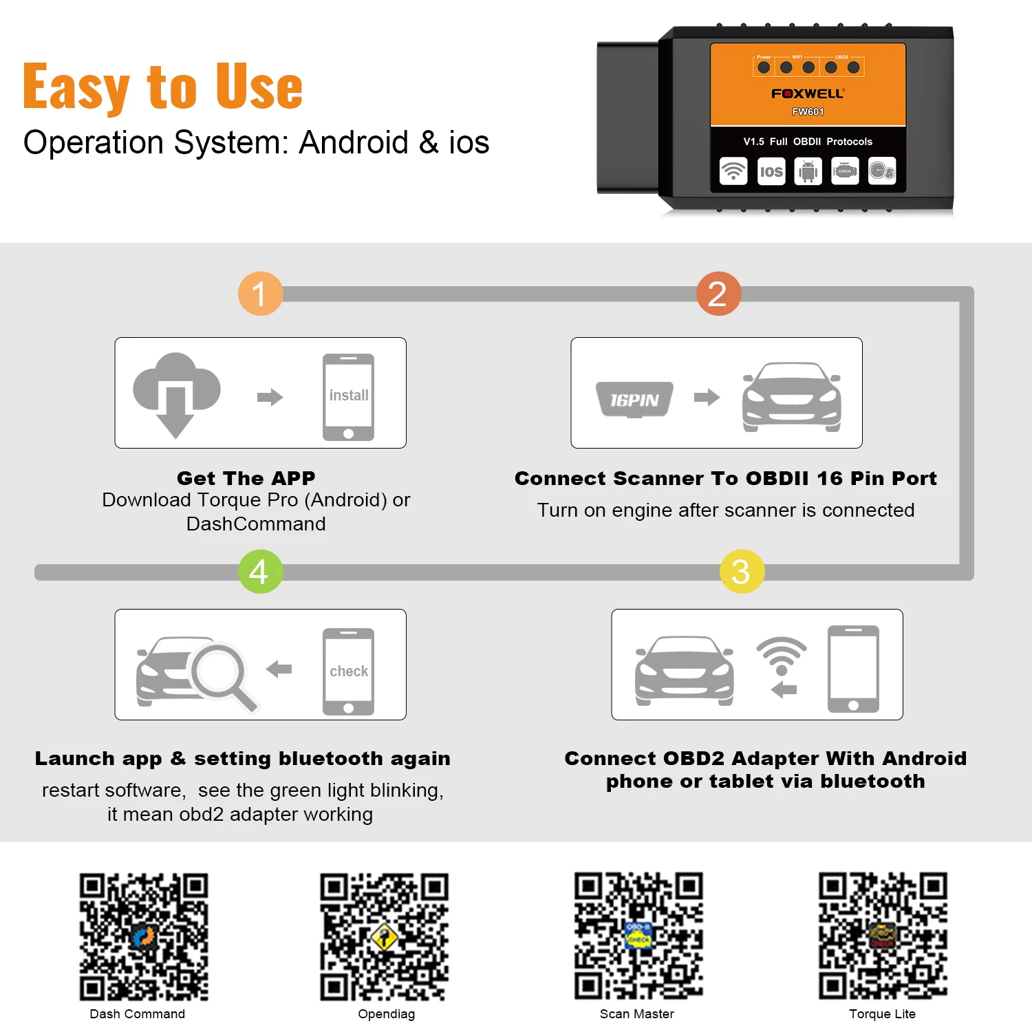 2. FOXWELL FW601 OBD2 ELM327 work on both android phone and ios phone , but can't work on car DVD.