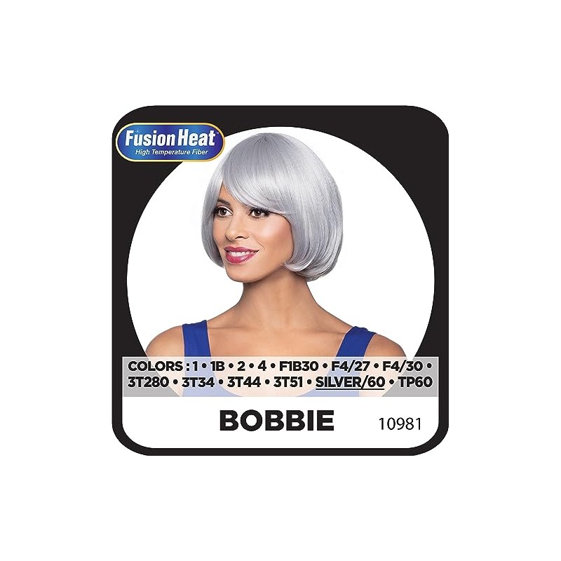 Foxy Silver Foxy Silver Bobbie is a synthetic hair full wig with short, straight style with spitcurl Bob. This beautifully styled wig will highlight the excellence and elegance of your look with a simple wear! Crafted with high quality synthetic fibers, they recreate the luscious appearance and texture of human hair without the styling hassle. A machine-stitched standard wig cap allows, durability, security, and a snug fit which lasts all day. Available in a wide number of solid and highlighted colors, the Foxy Silver Bobbie is ready to wear straight from the package.
