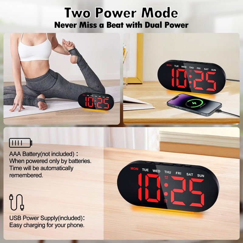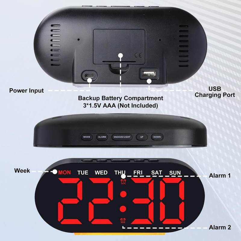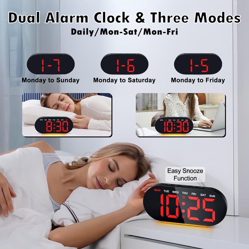 - 【Dual Alarm Clocks】Stop fighting over wake-up times! With independent dual alarms, you and your partner can finally declare a truce. Early-bird catching the 6AM flight? Night owl craving Sunday brunch in bed? Bedroom alarm clocks now play for both teams. Set weekday hustle mode for your 9-to-5 grind, weekend mode for lazy cuddle sessions – or mix-and-match days like a pro. No more compromise, no more chaos.
