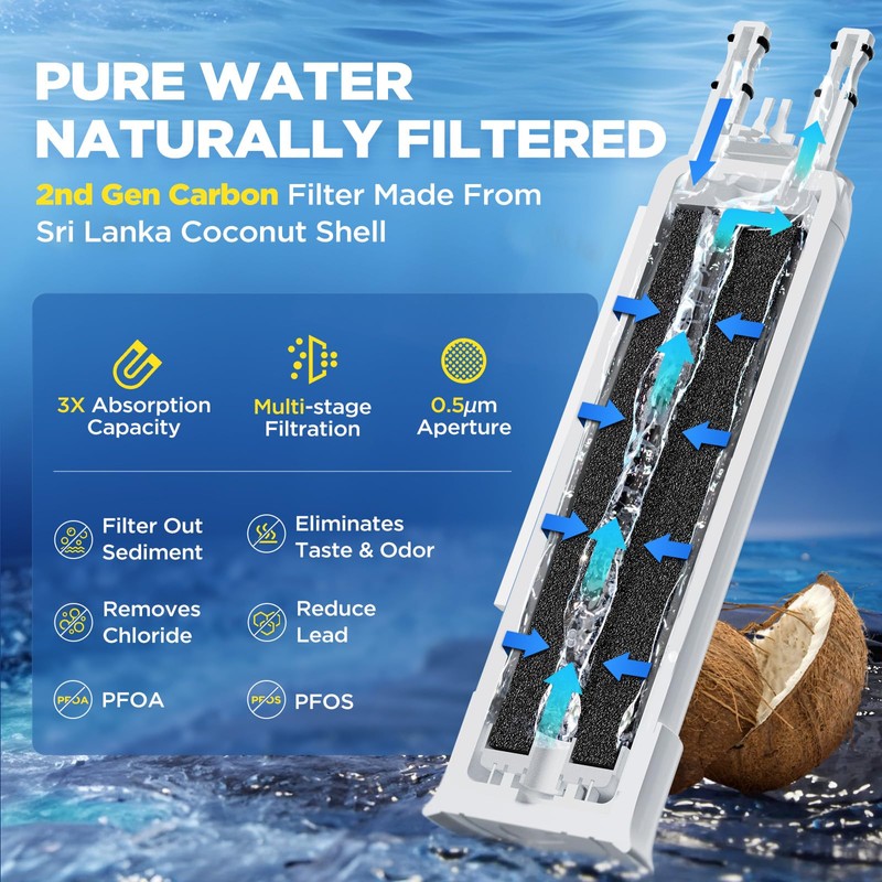 • PURE WATER, NATURALLY FILTERED - Featuring 2nd generation built-in carbon filter made from Sri Lanka coconut shell, our water filter can purify water in a natural way with 3X absorption capacity of others. The replacement effectively removes impurities like sediment, chlorine, lead, unpleasant tastes and odors through its multi-stage filtration process and apertures that are less than 0.5μm, ensuring safe and clear drinking water for you and your family.