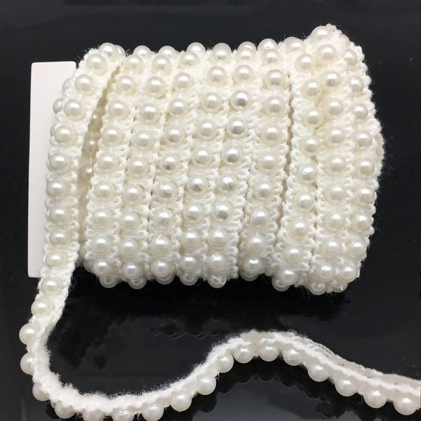 FQTANJU 5 Yards Faux Pearls Lace Ribbon Applique Pearl Fringe for Wedding Party Decoration, Home Deco, Lamp Shade, Costume, Lvory. Style 2