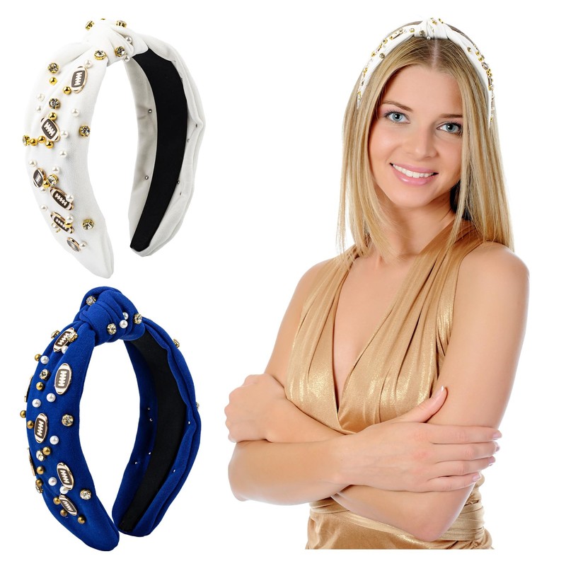 - Quantity: You will receive two colors of football knotted headbands, white and blue, which can showcase your love for football and sports. This headband is composed of a football talisman, rhinestones, and pearl decorations, making it the perfect accessory for any football fan