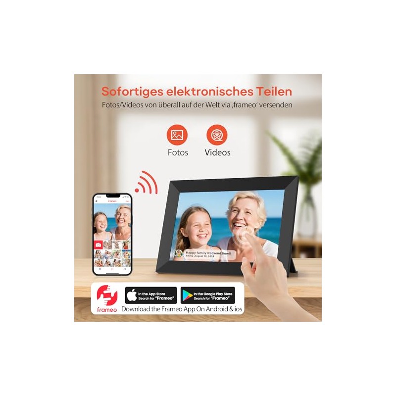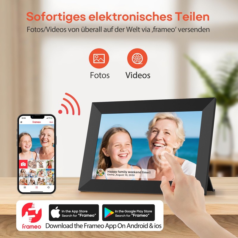 - Share photos and videos instantly via the "Frameo" app: Share every wonderful moment with your family and friends. Connect the digital photo frame to a WiFi network and share photos and videos (up to 15 seconds) anytime and anywhere via the "Frameo" app. Photos and videos can be viewed in seconds. Add photos titles to fully express your mood and experiences! Download the "Frameo" app for iOS and Android for free and enjoy complete control of the digital photo frame.