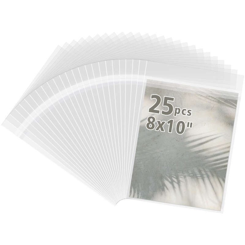 Frametory, 25 Pack 8 1/4" x 10 1/8" Acid-Free Clear Plastic Bags, Self Seal Crystal Photo Sleeves for 8X10 Framing Mat Mattes, Prints, Artwork