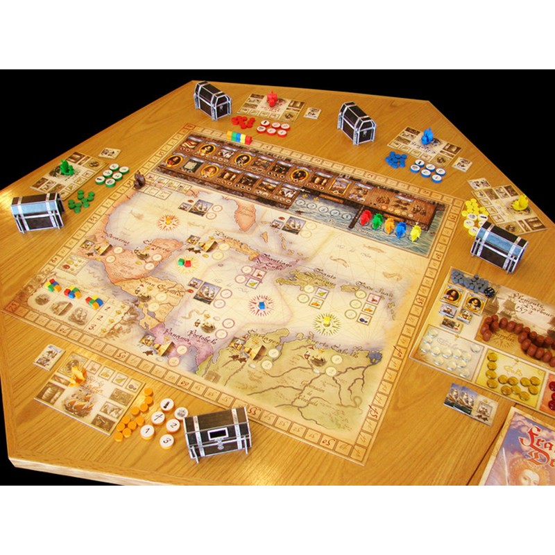 Francis Drake follows Triassic terror in the series of “big box games" from Peter hawse & Eagle-Gryphon Games. Return to a bustling Plymouth harbor in 1572 as an aspiring Elizabethan Captain making preparations for three exciting voyages to the Spanish main in search of fame and fortune! player captains plan their missions and Provision their ships accordingly. This is a race to see who can set sail to ravish the Spanish main and claim the riches of the Aztec and inch empires first.