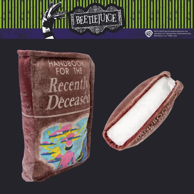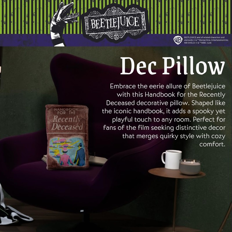 - BEETLEJUICE DESIGN: Embrace the eerie allure of Beetlejuice with this Handbook for the Recently Deceased decorative pillow. Shaped like the iconic handbook, it adds a spooky yet playful touch to any room. Perfect for fans of the film seeking distinctive decor that merges quirky style with cozy comfort.