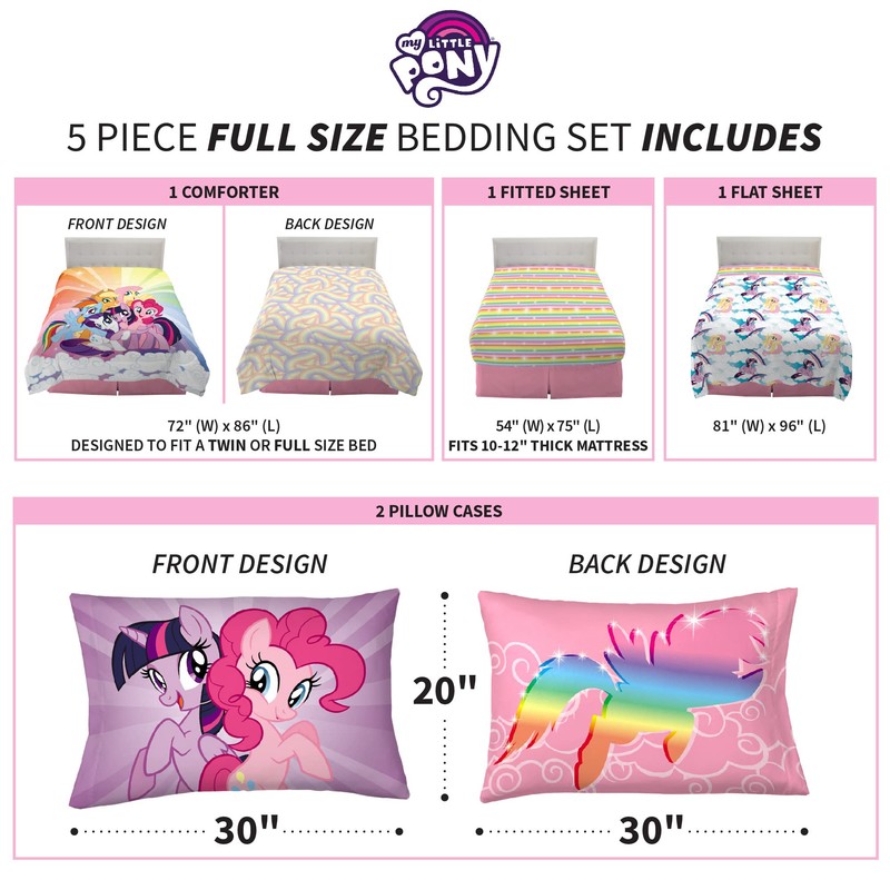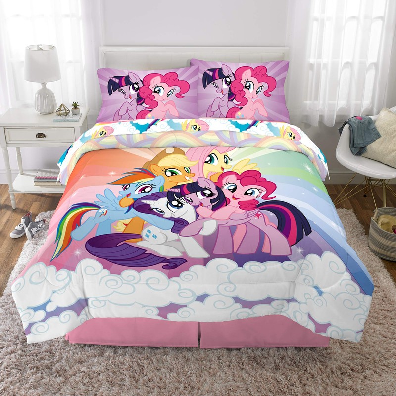 - HASBRO MY LITTLE PONY DESIGN: My Little Pony fans will be over the rainbow with this cool and colorful comforter and sheet set. Featuring Rainbow Dash, Applejack, Pinkie Pie, Fluttershy, Twilight Sparkle and Rarity, this bedding bundle is packed with all of her pony pals. Fans of Hasbro’s popular My Little Pony characters are sure to love the comfort and style of this adorable bedding.