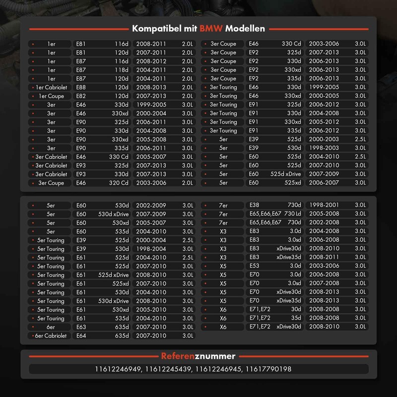 - Suitable for: Compatible with 1 Series E81 116d 120d 2.0L 2007-2011, 1 Series E87 116d 118d 120d 2.0L 2004-2012, 1 Series E88 120d 2.0L 2008-2013, 1 Series E88 120d 2.0L 2008-2013. 2 120d 2.0L 2007-2013, 3 Series E46 330d 330xd 330 Cd 320 Cd 2.0L-3.0L 1999-2007, 3 Series E90 325d 330d 330xd 335d 3.0L 2004-2004 11, 3er E93 325d 330d 3.0L 2007-2013, 3 Series E92 325d 330d 330xd 335d 3.0L 2006-2013