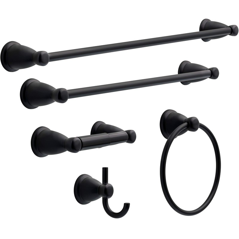 The Franklin Brass Kinla Collection helps complete your bathroom with both style and functionality, keeping everything you need within arms reach. This convenient 5-piece bath accessory set in matte black can instantly upgrade the look and feel of your space. The set includes a wall mounted towel ring, wall mounted towel hook, wall mounted spring loaded toilet paper holder, a 24" wall mounted towel bar and an 18" wall mounted towel bar. The towel ring, towel hook and towel bars provide ample storage as towel holders in both main and guest bathrooms. The wall mounted bath tissue holder completes the collection adding a stylish, functional touch. All mounting hardware and an installation template are included, making installation a breeze for the weekend DIYer. Install with confidence knowing that Frankin Brass provides a limited lifetime warranty so you can enjoy a look you love for life.