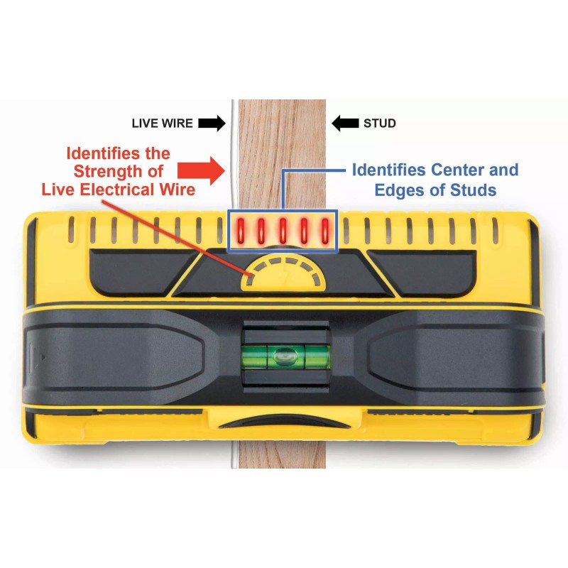 - Extra Features: Live Wire Meter, Built-In Bubble Level and Convenient Pencil Caddy. Uses common AA batteries. Now compatible with reachargeable batteries!