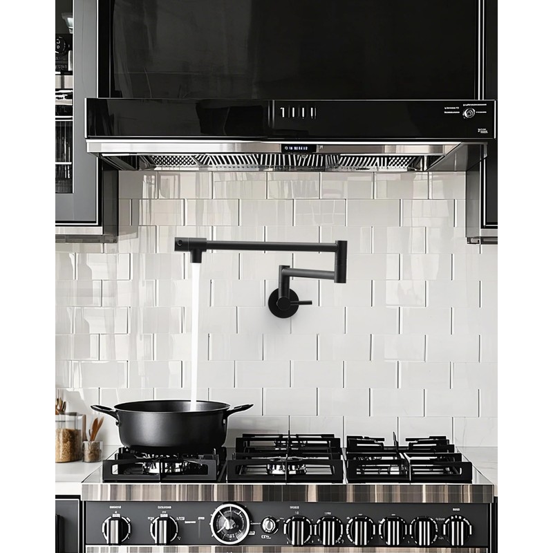 Fransiton Matte Black Pot Filler, Pot Filler Faucet Wall Mount, Brass Folding Stretchable with Double Joint Swing Arm Single Hole Two Handles Kitchen Restaurant