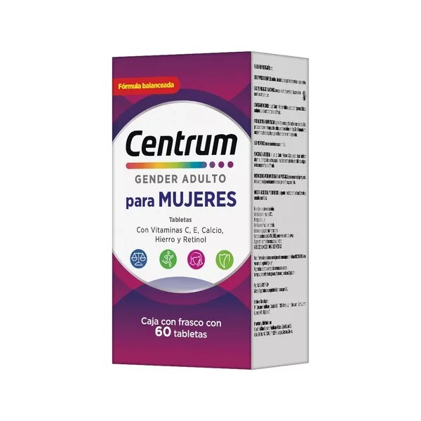 Frasco Multivitamínico Centrum Mujer con Vitamina C Vitamina E Calcio Hierro y Retinol 60 Tabletas Sin sabor