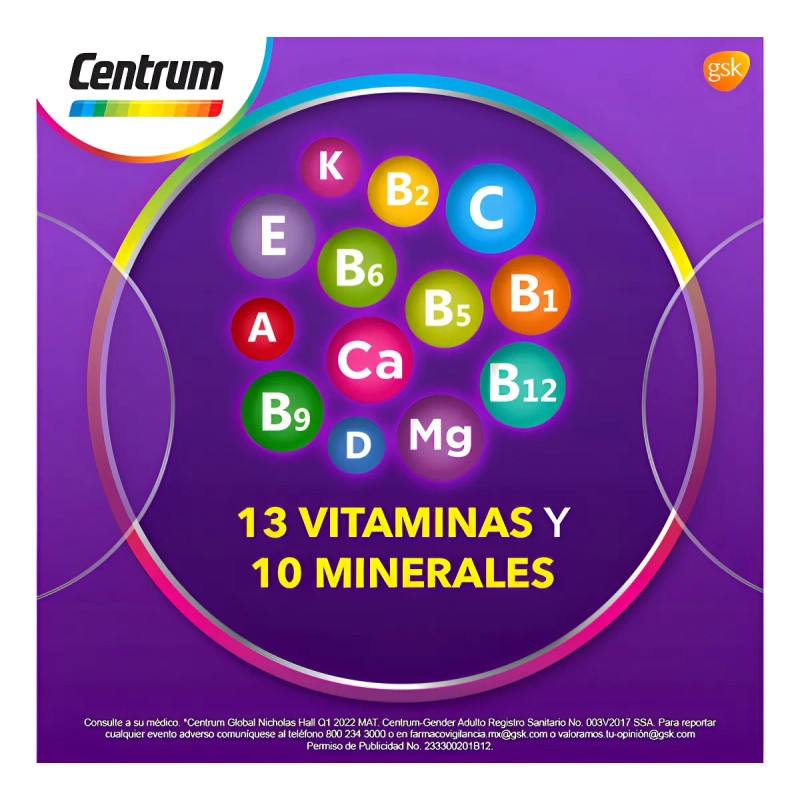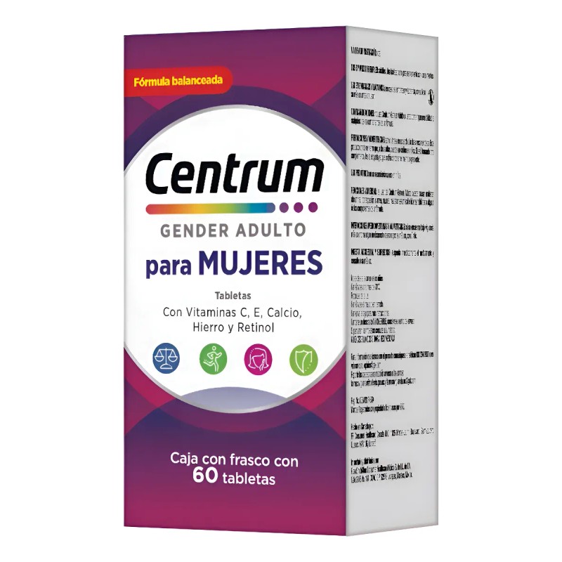 Frasco Multivitamnico Centrum Mujer con Vitamina C Vitamina E Calcio Hierro y Retinol 60 Tabletas Sin sabor