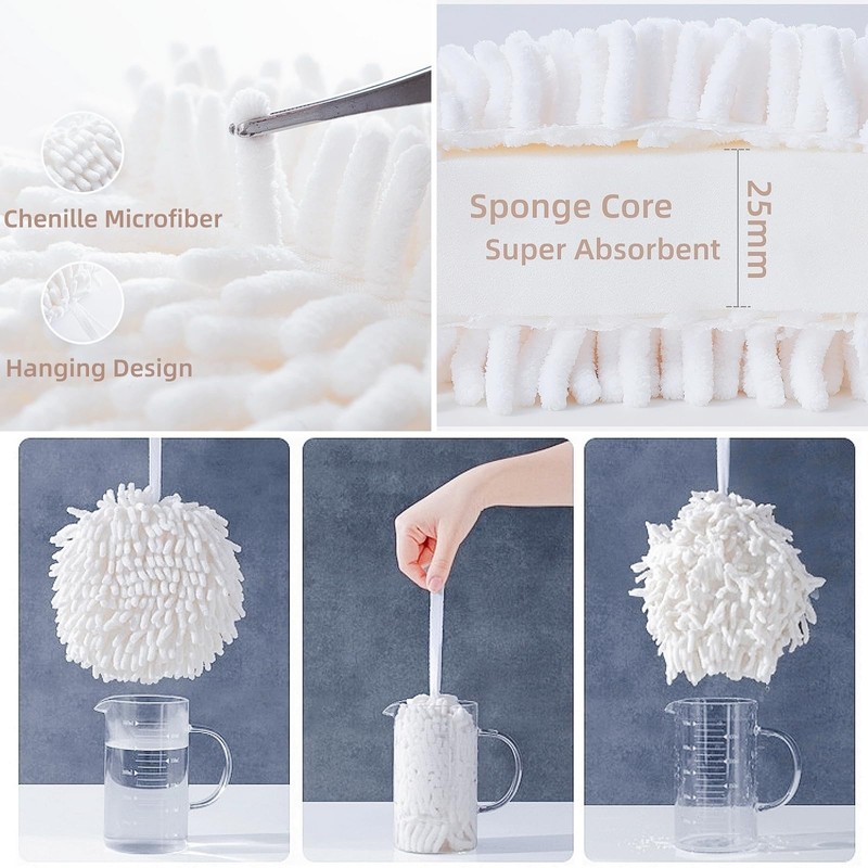 - [SKIN-FRIENDLY CHENILLE]: Our fuzzy ball hand towel is made of chenille microfiber, high absorbent material that dries your hands almost instantly. Compared with ordinary towel and facial tissue, not only soft and absorbent, but also comfortable, skin-friendly and more environmentally friendly. In the cold winter, what a warm home experience it will be when you have a fluffy chenille fuzzy ball hand towel that you can not only quickly dry your wet body and hands, but your skin won't become dry as a result.