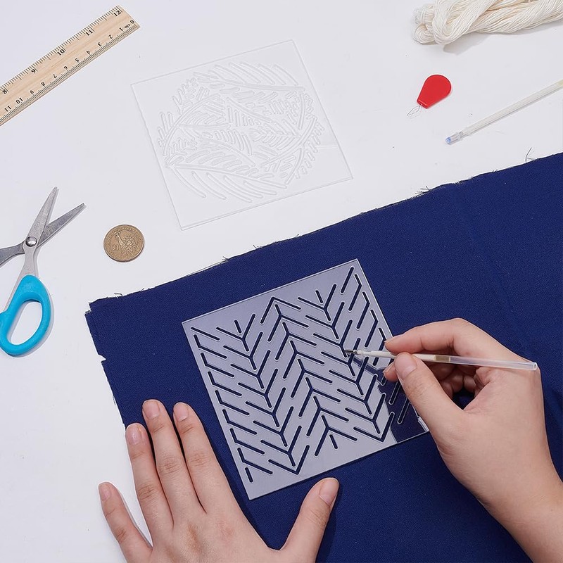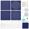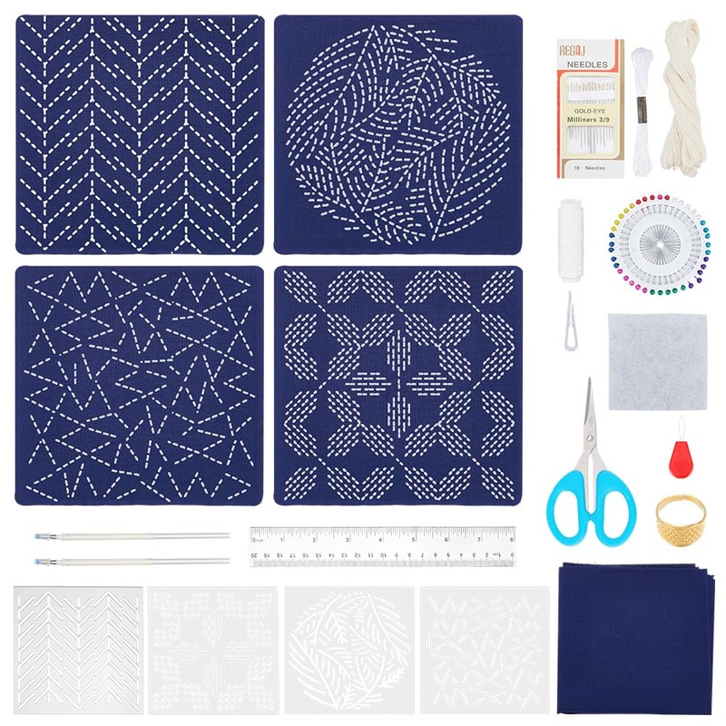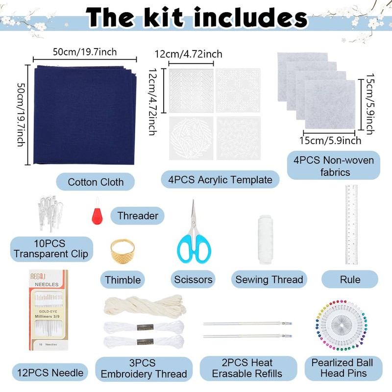 - Complete Sashiko Coasters Kit: There is 2pcs 50*50cm navy blue cloth, 4 acrylic templates (12*12cm), 2 white water soluble pens, embroidery needles, embroidery thread, thimble, 1 threader, 10 clips, etc. A complete set for sashiko practice.