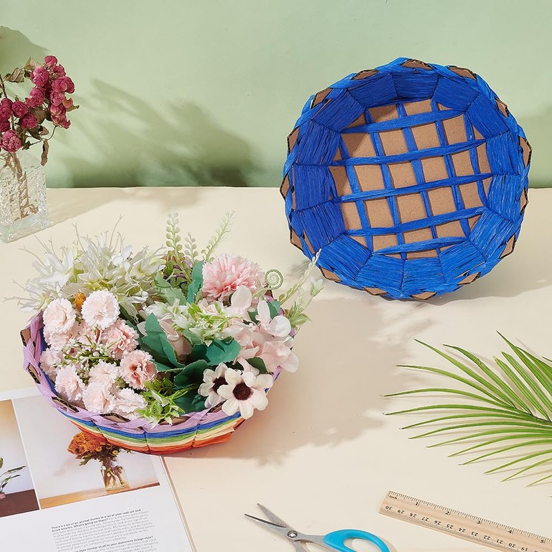 - Woven Basket Kit: The Woven basket kit includes 9 sheets of woven paper blue card (30*30 cm), six rolls of raffia (green, red, pink, blue, orange, yellow, 20m).