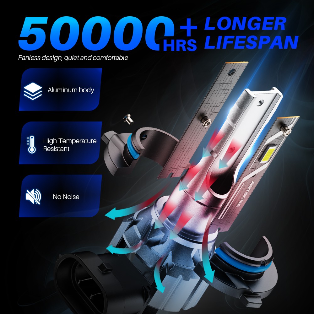 Built with a durable aluminum body, high-temperature resistant and an IP67 waterproof rating, 9006/HB4 bulbs are ready to perform in all weather conditions. Designed to be fanless of no noise, and last up to 50,000 hours, giving you reliable performance for the long term.