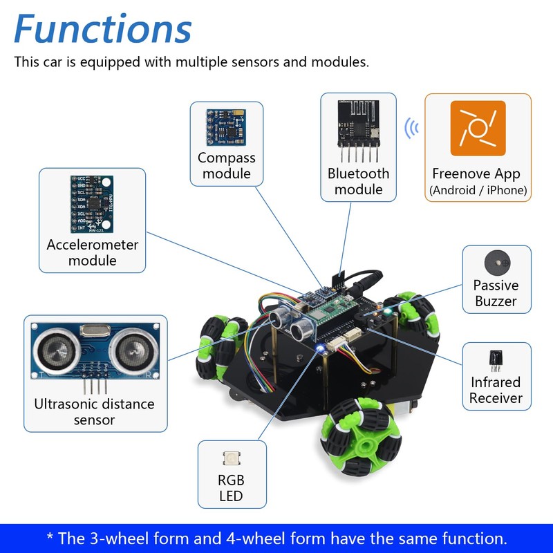 Freenove Omni Wheel Car Kit for Raspberry Pi Pico W (Included) (Compatible with Arduino IDE), 3-Wheel and 4-Wheel Forms, Accelerometer Module, Compass Module, Ultrasonic Distance Sensor