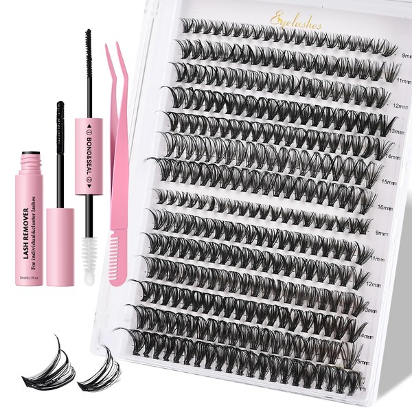 FREEORR 280Pcs Lash Extension, Wispy Fluffy Eyelash Cluster, 9-16mm DIY Lashes, 30D and 40D Mix Reusable Individual Eyelash Extensions with Lash Bond and Seal, Remover, Tweezers for DIY