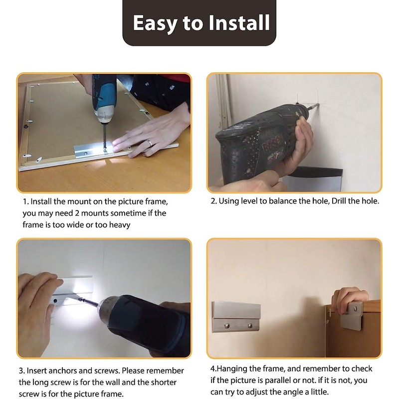 • [ Easy to Install ]: This interlocking wall mounting bracket hardware kit includes all of the tools for a quick and easy installation. With mini square spirit level that can keep standard level, you’ll have all you need to begin hanging your memories throughout home