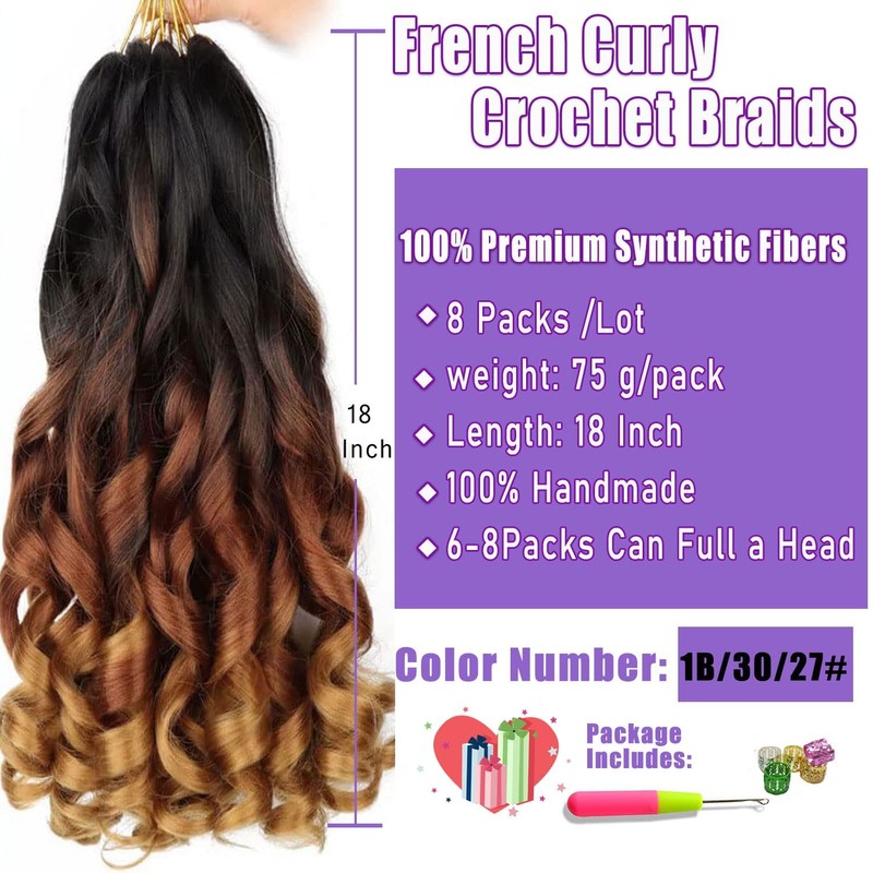 - Specifications for French curl braids: Length of French braiding hair: 18/24 inches to choose from, weight: 75 ± 5 g/pack, packaging: 8 packs/lot. Usually 6-8 packs for a full head. There are many colours to choose from. There is always one for you.