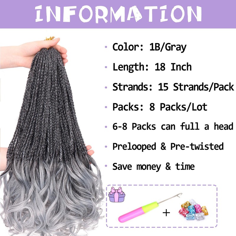 French Curl Crochet Braids 18 Inch 8 Packs Goddess Box Braids Crochet Hair for Women Gray Pre Looped Crochet Box Braids with Curly Ends Synthetic French Curly Braiding Hair Extensions (1B/Gray)