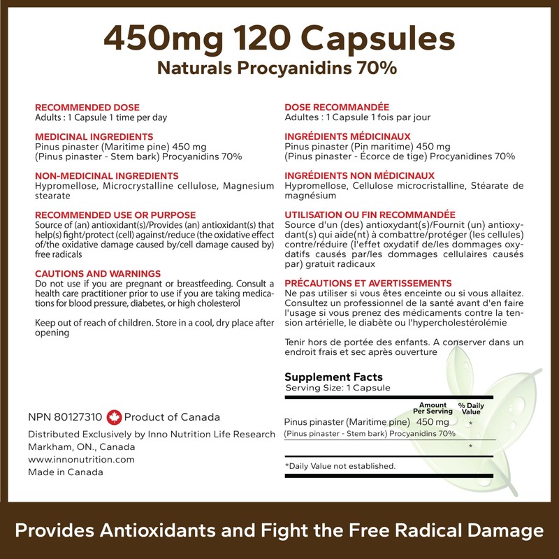 French Maritime Pine Bark Extract Strength 450 mg 120 Capsules 4 Month Supply Antioxidant Properties Cardiovascular Health Non-GMO No Sugar Allergen Free Made In Canada