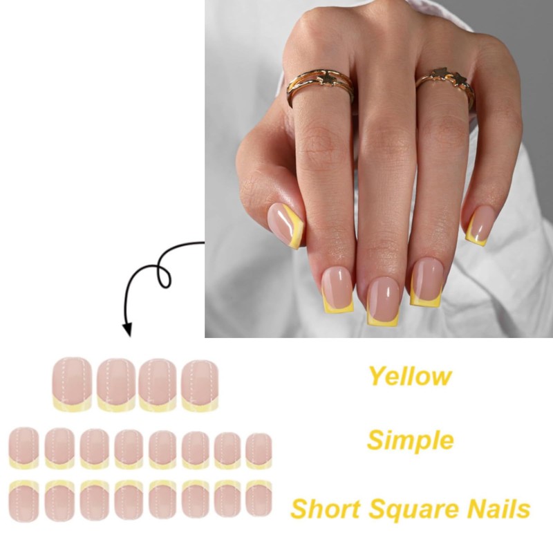- 【Yellow-edge French Fake Nails】These charming yellow-edge nude pink French fake nails are the perfect spring and summer accessory, adding a touch of sweetness and elegance to your look. Designed to appear natural and flattering, they complement all skin tones and hand shapes beautifully, creating a effortlessly polished appearance.