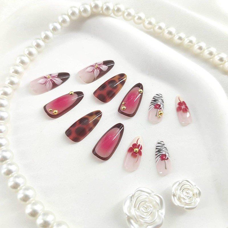 French Tip Press on Nails Almond Medium Fake Nails with Flower Fruit Leopard ...