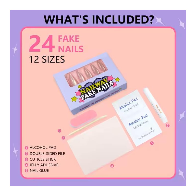 - COMPLETE SET: Includes 24 nails in various sizes to ensure perfect fit for all finger sizes, plus necessary application tools