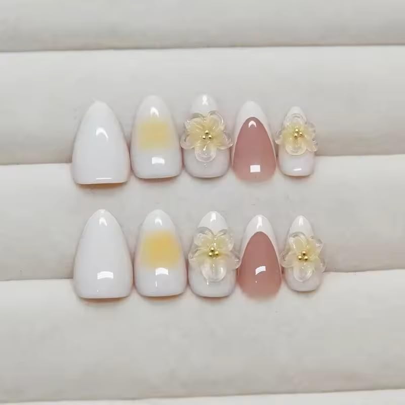 - ELEGANT DESIGN: Features a sophisticated French tip design in almond shape with delicate 3D flower embellishments in nude and white color scheme