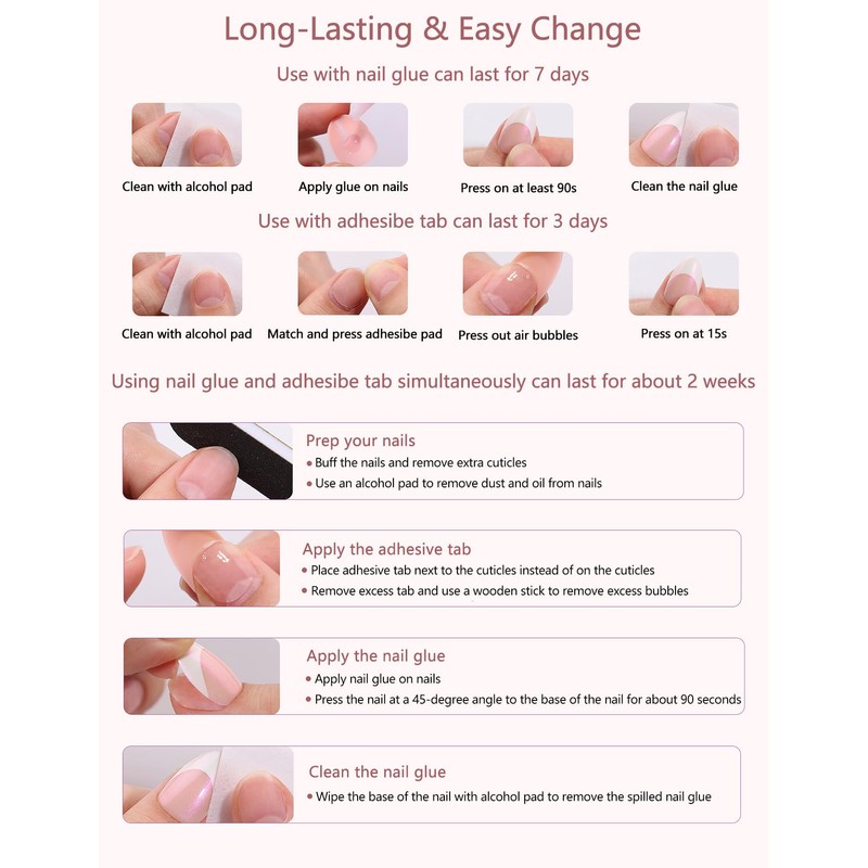 - Long-Lasting & Easy Change: If you want to wear them for a long time, we recommend using both nail glue and adhesive tabs. If you want to change the design every week, just use the glue. Adhesive tab are suitable for dates or small events and can be reused
