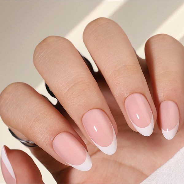 French Tip Press On Nails Almond (Soft French) Medium Length Reusable Stick On Nails with Glue in 15 Sizes – 32 Soft Gel Fake Nails Kit
