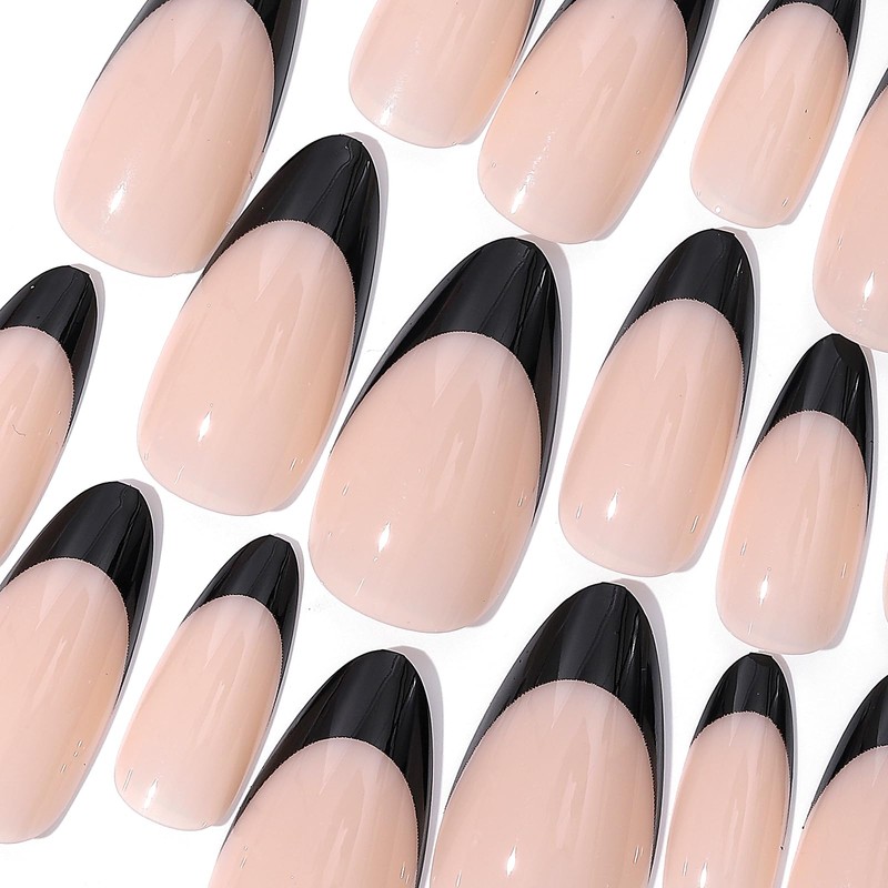 French Tip Press On Nails Almond Tejecu Black Tip Press on Nails Medium False Nails for Party Reusable Stick On Nails in 12 Sizes And 24pcs Fake Nails set