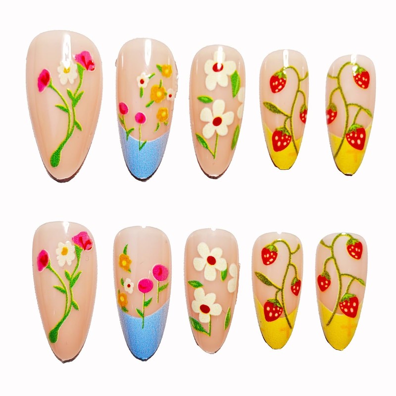 - High-Quality Material: Summer nails press ons is made of high-quality ABS acrylic material. It is odorless,not easy to fade. It is harmless to your body and nails, and supplies you with a comfortable and wonderful experience.