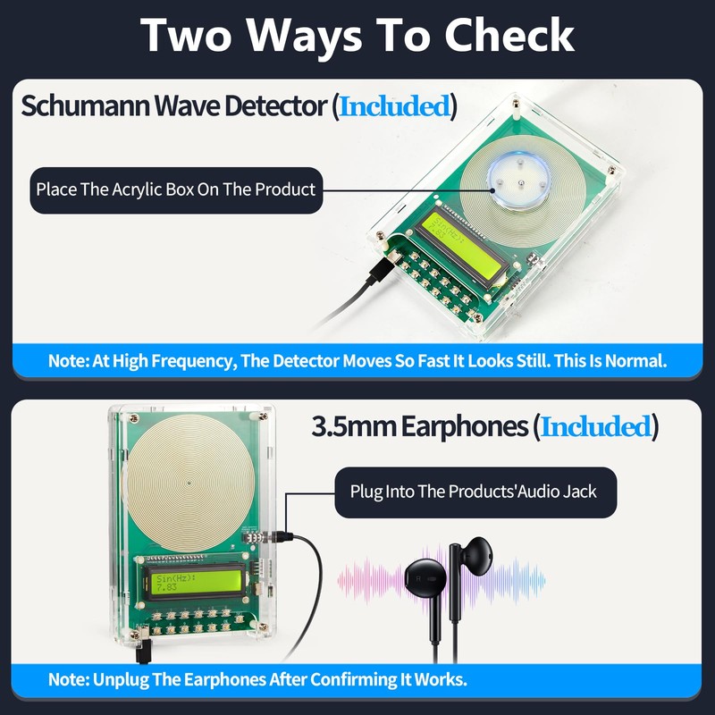 - 【Two Ways To Check】This device comes with a Schumann wave detector and wired headphones, letting you check if it's working correctly in two simple ways. You can use the detector for direct measurement or listen through the headphones to confirm the frequency. These options make it easy for anyone to use and ensure the device works properly for better healing and relaxation.