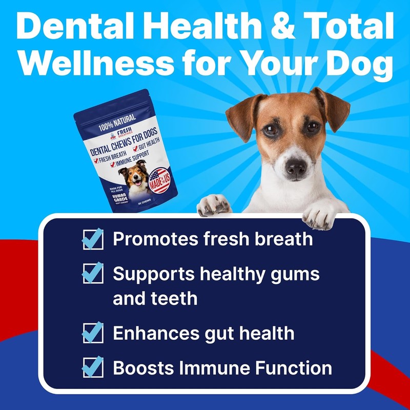 Fresh Breathies, All-Natural Dental Chews for Dogs, Dog Breath Treatment That Supports Gut Health and Immune System, Dog Teeth Cleaning Chews, Dental Treats for Dogs Made in The USA, 30 Count