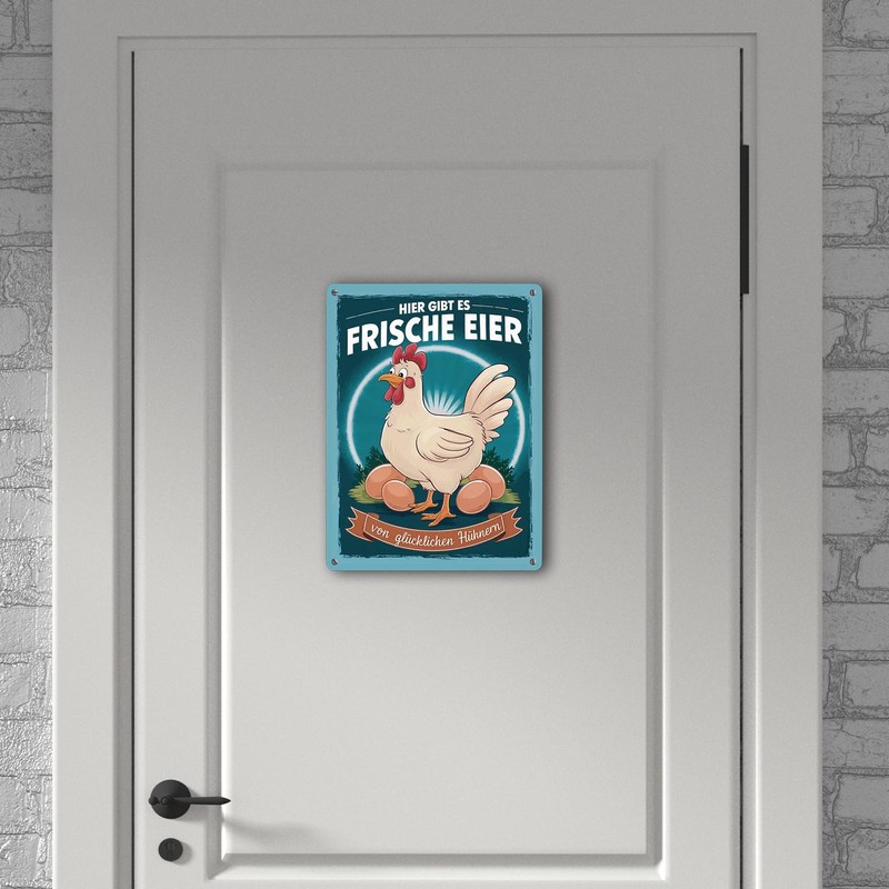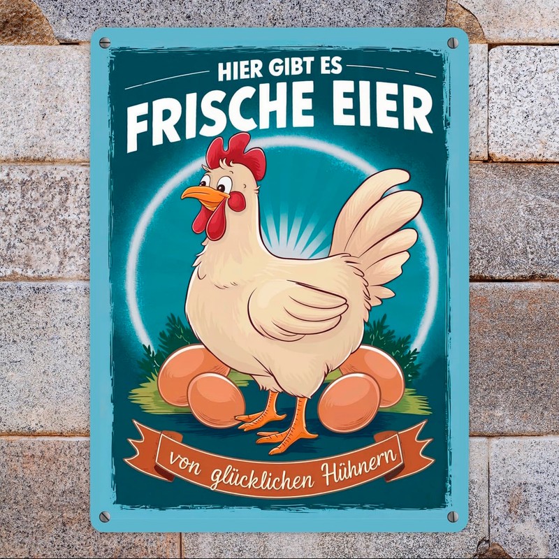 - Our metal sign is not only robust, but also a real eye-catcher. The turquoise-light blue colour gradient in the background gives your home the perfect rustic flair. And the saying: Here there are fresh eggs from happy chickens ensures a good mood at breakfast or at the farm shop.