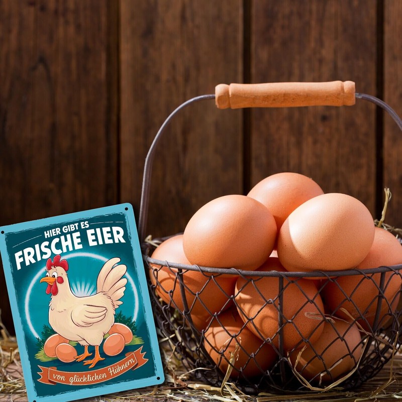 - Box contents: 1 x fresh eggs of happy chickens metal sign XL in 21 x 28 cm