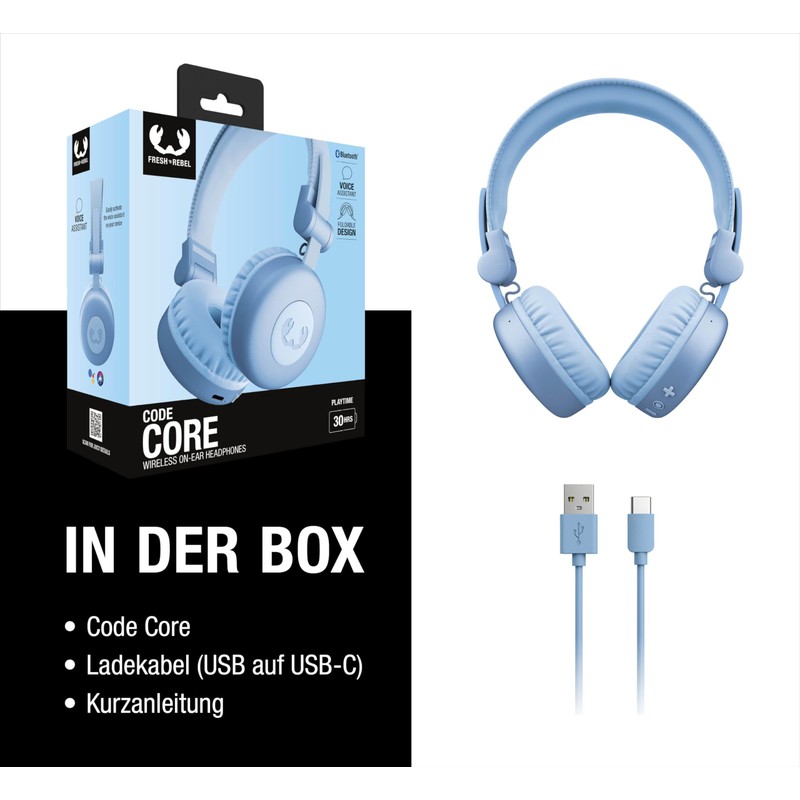 The Code Core from Fresh 'n Rebel is your introduction to a first-class audio experience. These versatile wireless headphones combine state-of-the-art technology with unbeatable comfort, making them the perfect companion for every moment of the day. UNLEASH THE WIRELESS FREEDOM Say goodbye to tangled cables and enjoy the convenience of wireless audio with seamless Bluetooth connectivity. Enjoy your favourite music or podcasts without interruptions. CUSTOMIZABLE ON EAR COMFORT The Code Core headphones are designed with versatility in mind, providing an on-ear fit that's perfect for the gym, travel, or everyday use. They provide a comfortable and secure fit and ensure that you can always immerse yourself in your music no matter where life takes you. Effortless playback control: Take control of your audio experience effortlessly. Adjust volume, skip tracks and manage calls with the built-in control buttons. Pause your playlist or answer calls without having to reach out to the device and stay in the moment. Collapsible & Portable Design:Fit your active lifestyle