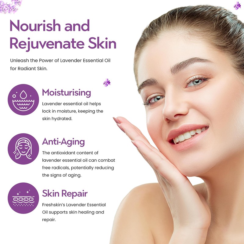 - Our best-selling lavender essential oil is naturally calming, helping to aid relaxation and promote good rest. Steam-distilled from the herb’s iconic purple flower heads, Freshskin Beauty lavender oil offers the distinctive floral aroma that’s so popular in aromatherapy, perfumes, beauty and cleaning products. A must-have for every home, lavender essential oil offers a range of benefits.