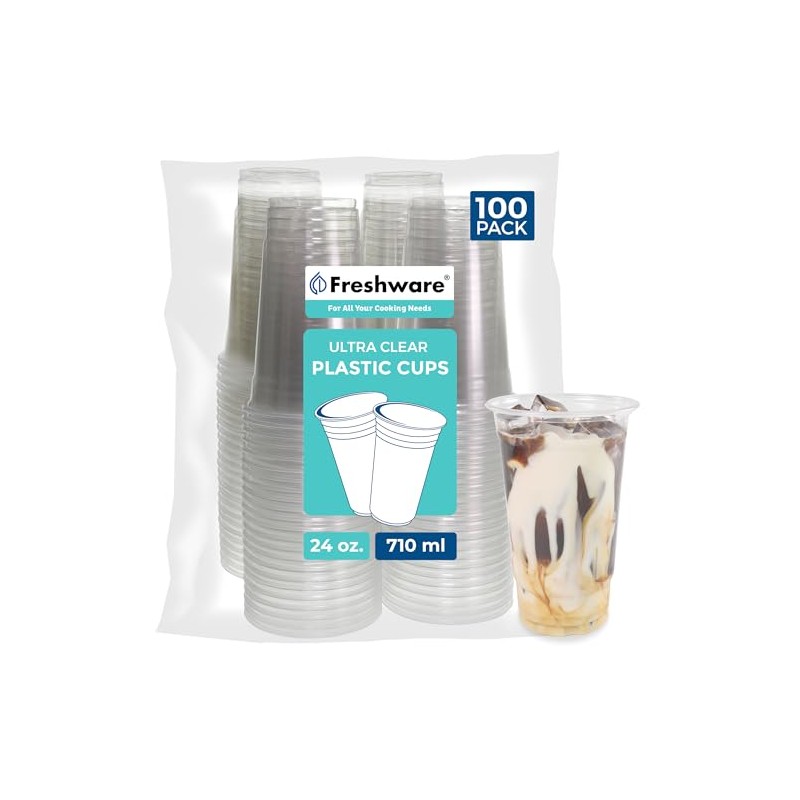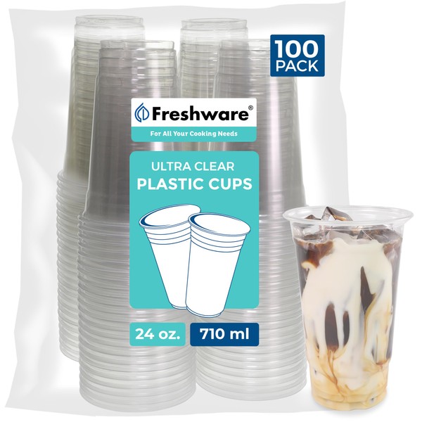 Freshware Clear Plastic Cups [100 Pack - 24 oz] Disposable Cups for Iced Coffee, Smoothie, Milkshake, Cold Drinks