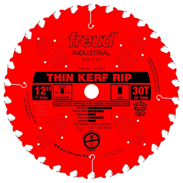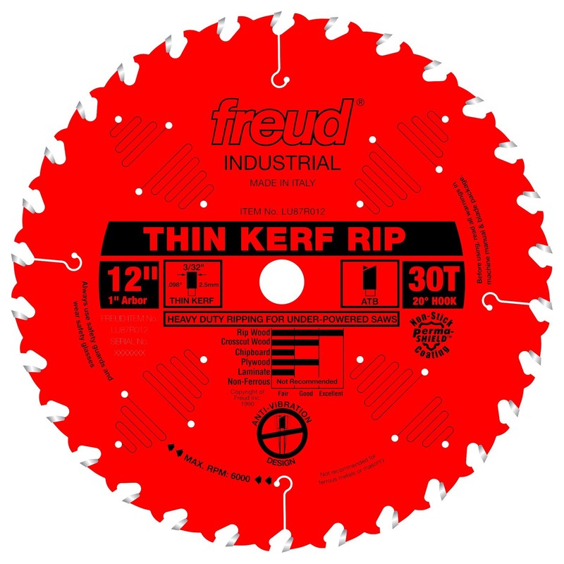 The 12-inch Freud LU87R012 Thin Kerf Rip Saw Blade makes quick work of ripping operations in hard- and softwood. It features 30 oversized teeth with alternating top bevels and thick TiCo high-density carbide tips designed to last, in addition to Freud's Perma-SHIELD coating, which reduces friction to prevent heat buildup. Plus, since it's a thin-kerf blade, it wastes less material and continues to cut cleanly when used with underpowered saws.