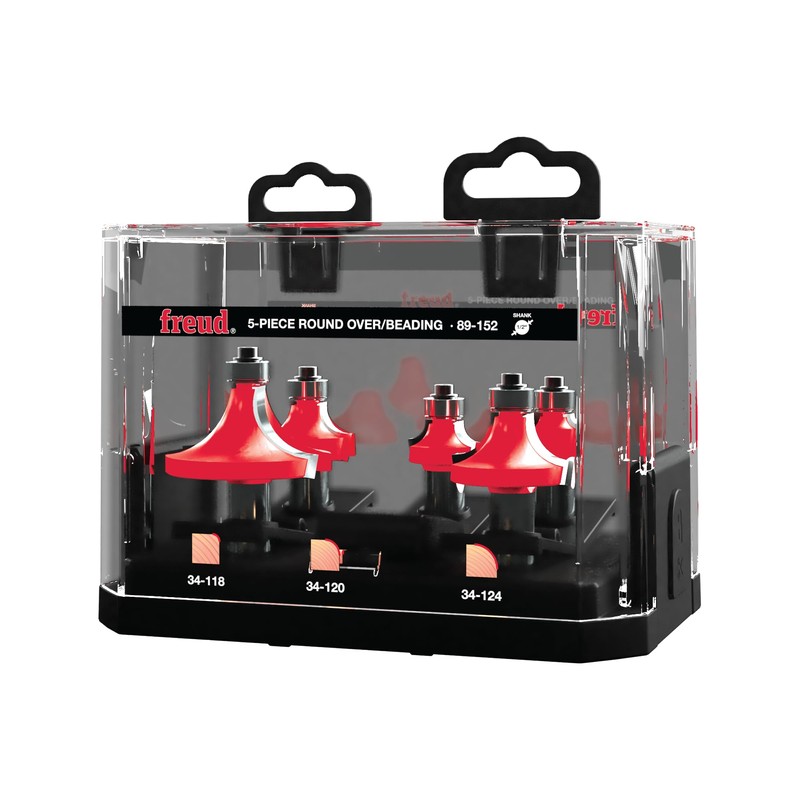 **About this Round Over and Beading Bit Set** The Freud 6-piece round over and beading bit set softens the edges of fine furniture. A 3/8-inch bearing is included to convert all five bits to beading bits, which help you produce a simple, decorative edge on furniture and moldings. Housed in a wooden storage box, these 1/4-inch shank bits cut all composition materials, plywood, hardwood, and softwood, and can be used on hand-held and table-mounted routers.