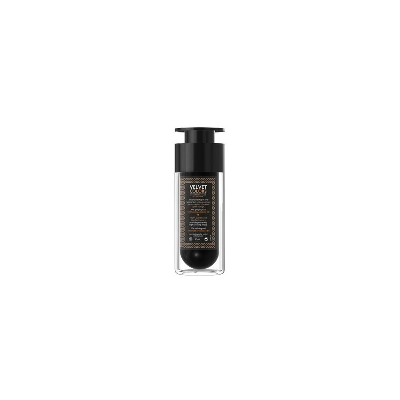 An extremely high coverage foundation with a velvety light matte texture and built-in very high broad-spectrum sun protection. Adapting to the natural tone of each skin, it immediately and completely covers even the most intense skin imperfections (discolorations, varicose veins, redness, vitiligo, scars, etc.) as well as tattoos, giving an even, natural, flawless effect without creating the effect of a "mask" without blocking the expression of the face, but also without hindering the "breathing" of the skin (High Cover Second Skin Masking Breathable Effect Technology) or clogging the pores. It spreads easily, without rubbing, and the color stays stable and unchanged with a matte finish for over 6 hours, while absorbing sebum by 20%2. With a specially developed formula,