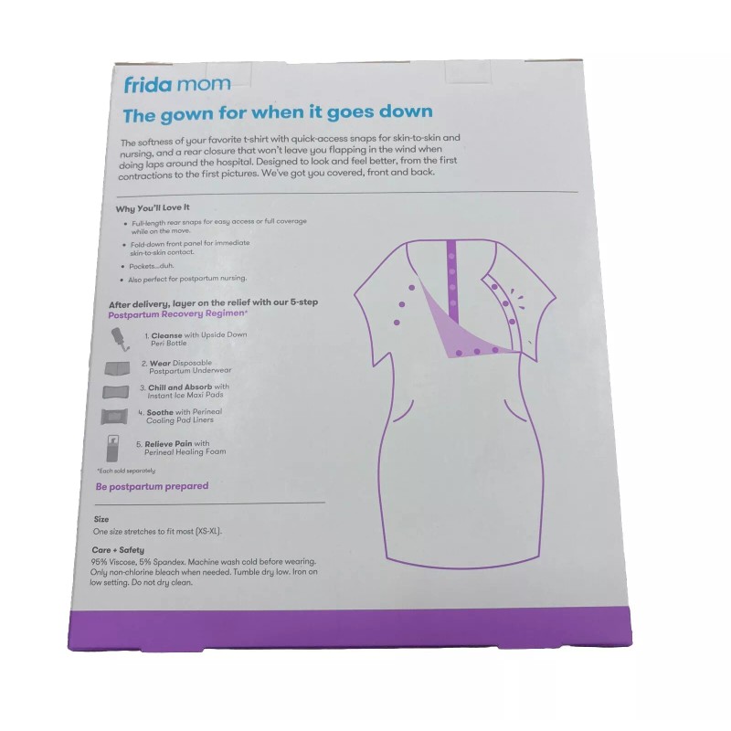 This Frida Mom gown is the perfect addition to your hospital stay. The gray color and soft fabric make it a comfortable and stylish choice for labor and delivery. The one size fits all design ensures a comfortable fit for all moms, while the Frida Mom brand guarantees quality.