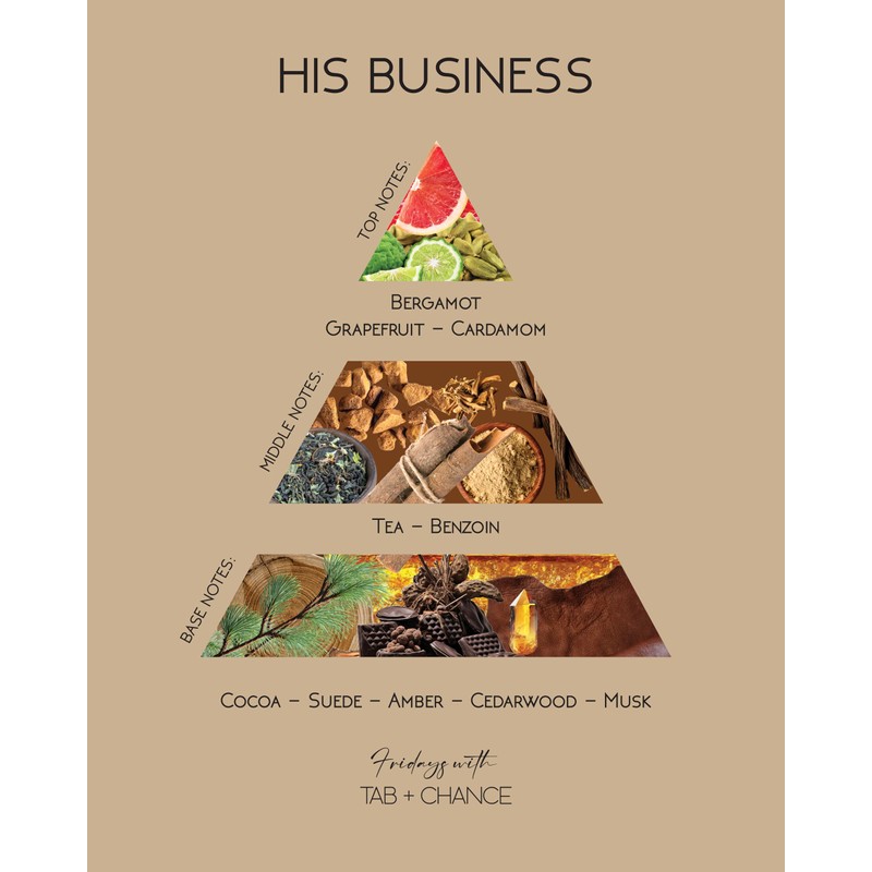 - Top Notes- Bergamot, Grapefruit, Cardamom Middle Notes - Tea, Benzoin Base Notes - Cocoa, Suede, Amber, Cedar wood, Musk